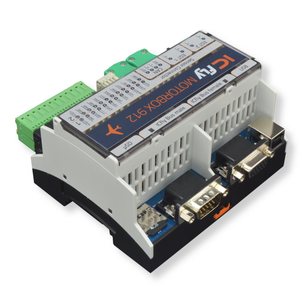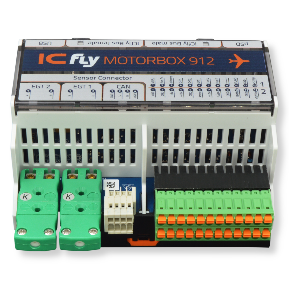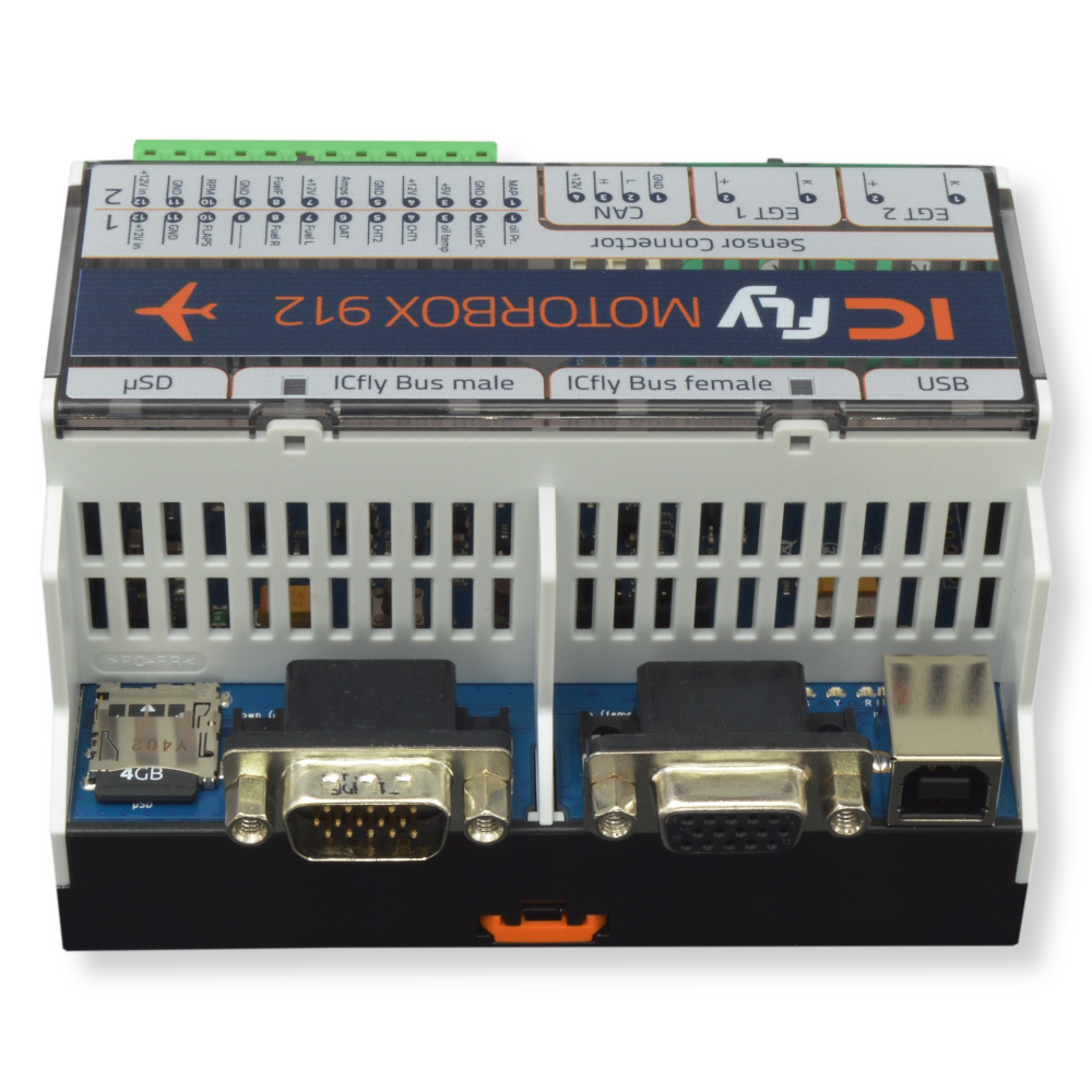 Die ICflyMotorbox erfasst die Motordaten des Rotax 912 und stellt diese auf dem ICflyBus als NMEA-Datensätze zur Verfügung. Die Motordaten können vom ICflyDisplay angezeigt oder mittels ICflyAHRS II bzw. ICflyConnect per WiFi an entsprechende Geräte weitergeleitet werden. Die App SkyMap unterstützt direkt die ICfly Motorbox. Die Motorbox kann entweder direkt mit den Sensorleitungen des Rotax belegt oder auch parallel an bestehende Anzeigen geklemmt werden. Die dafür notwendige Kalibrierung kann sehr komfortabel mittels Windos-Tool durchgeführt werden.
