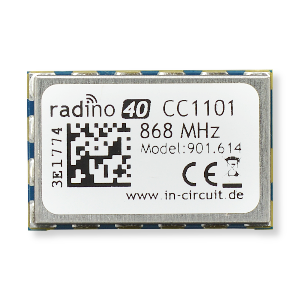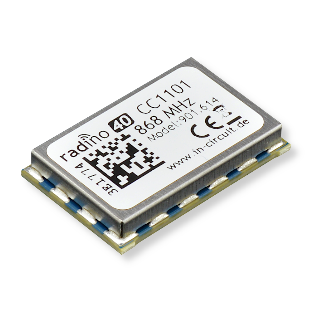 Das radino40 CC1101 868MHz kombiniert einen nRF52840 Mikrocontroller von Nordic Semiconductor mit dem CC1101 Funkchip von Texas Instruments zum kompakten radino40 Formfaktor. Der TI CC1101 ist ein energieeffizienzter Drahtlos-Transceiver für Sub-1 GHz. Der nRF52840 mit 32-bit ARM® Cortex®-M4 CPU mit FPU, 64 MHz Taktfrequenz, 1MB Flash, 256 MB RAM stellt optimale Rechenleistung und optimale Low-Power Funktionalitäten zur Verfügung. Darüber hinaus bietet er eine eigene 2.4GHz Funkschnittstelle mit zahlreichen unterstützten Funkstandards an.